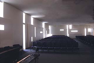 McClellan remembers saying: "Let’s open up this window, put a wall in front of it, and then put the pulpit in front of the wall." That basic proposition became the starting point for design of the sanctuary. A stage-like platform the length of the wall supports a small musical group and several chairs, in addition to the podium. In the center, natural light breaks from behind a double screen wall that forms an abstract cross-shaped pattern. The source of the light is a pre-existing window, narrowed to a horizontal strip near the ceiling.