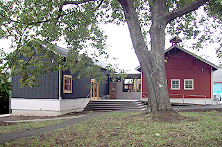 The new museum began with a historic schoolhouse. A transparent “gasket” section connects the historic structure to the addition. Decks and cascading stairways on either side of the lobby blend the structure with its surroundings.