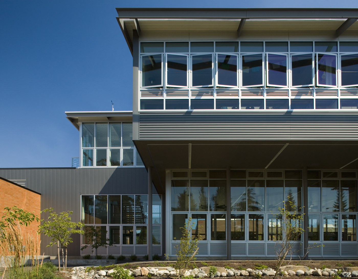 Classrooms are on the second level. The inside is suffused with light, and a slight overhang creates a sheltered plaza area.