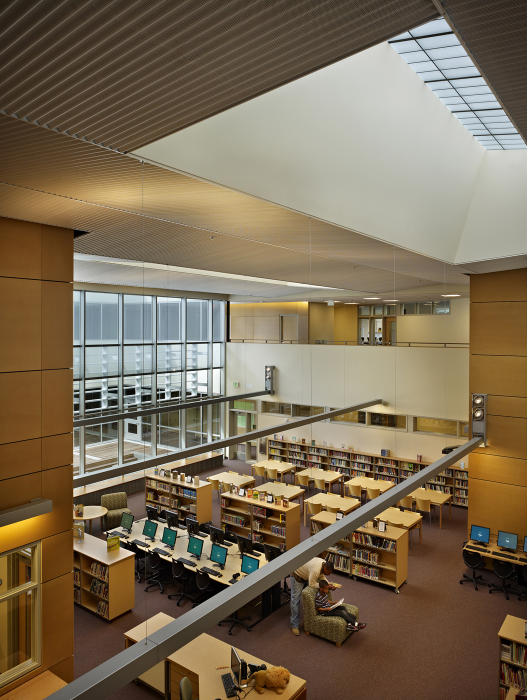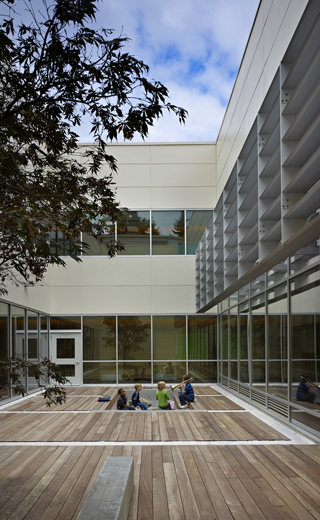 The openness of that interior is breathtaking. Abundant light in the library comes not from perimeter walls but from a large skylight overhead. Light also washes in through a two-story glass wall with an enclosed outdoor space on the other side. Kids regularly flood into the courtyard for activities or just to let off steam, perching on the edges of a sunken Zen garden or benches next to a single maple tree.