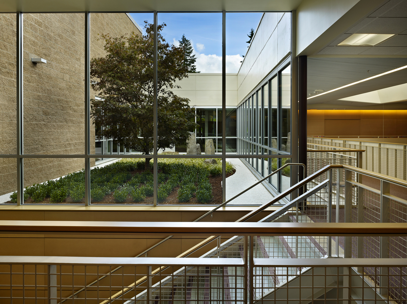 But step inside and the school reveals a heart of pure Zen. The entry leads to an inner corridor that’s really a bridge. The floor drops away to reveal a new, lower level and a large, bright library and meditative courtyard.