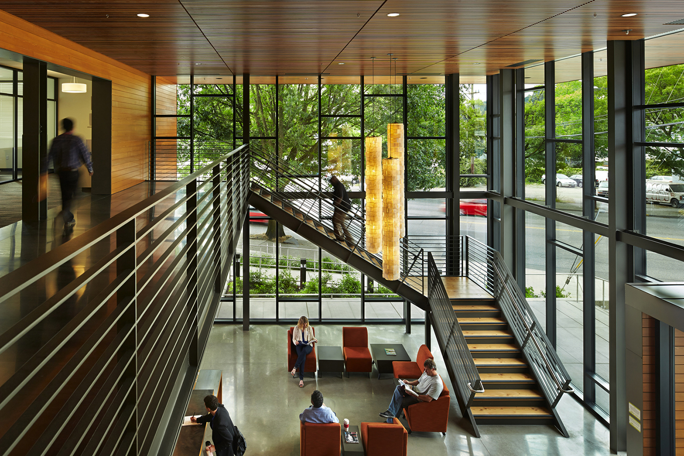 Inside and out, eyes go to a large, glowing light sculpture by Seattle-based artist Yuri Kinoshita. It hangs beside a grand, open stairway — designed to draw people out of the elevators and into light and views — and get them moving.
