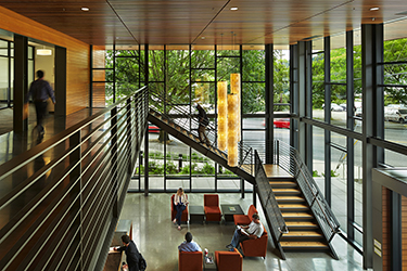 Most of the length is filled with flexible classrooms and office space. However, “There are a couple of key moments,” said Franko. One of those “moments” — breaks in the repetitive pattern of the outer walls — is the entrance. One-story glass walls wrap around the building and the lobby inside, framed by projecting walls and ceiling. The walls inside are paneled with warm cedar, and the same material lines those walls as they project outward around the entrance.