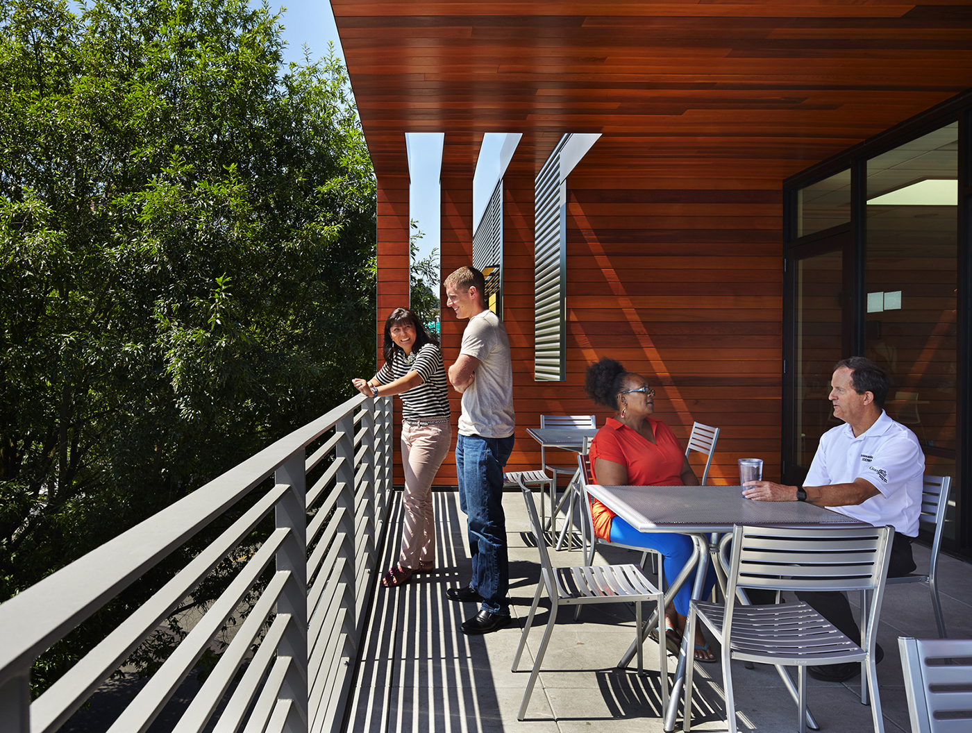 Then there's that balcony — projecting from the top floor near the tree canopy and above the traffic, focused on the mountain. Also lined with cedar paneling, it works like a family living room, where business is sometimes done. Wrapping around the corner, it's open on two sides.