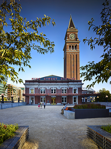 The adjoining Jackson Street Plaza is the station's civic front door. The open space has sculptural raised planters that double as seating. Euro-style decayed granite underfoot has a timeless quality. Cherry trees in the planters were chosen as a nod to the International District. The combination of soft and hard elements link the historic station with the modern city.
