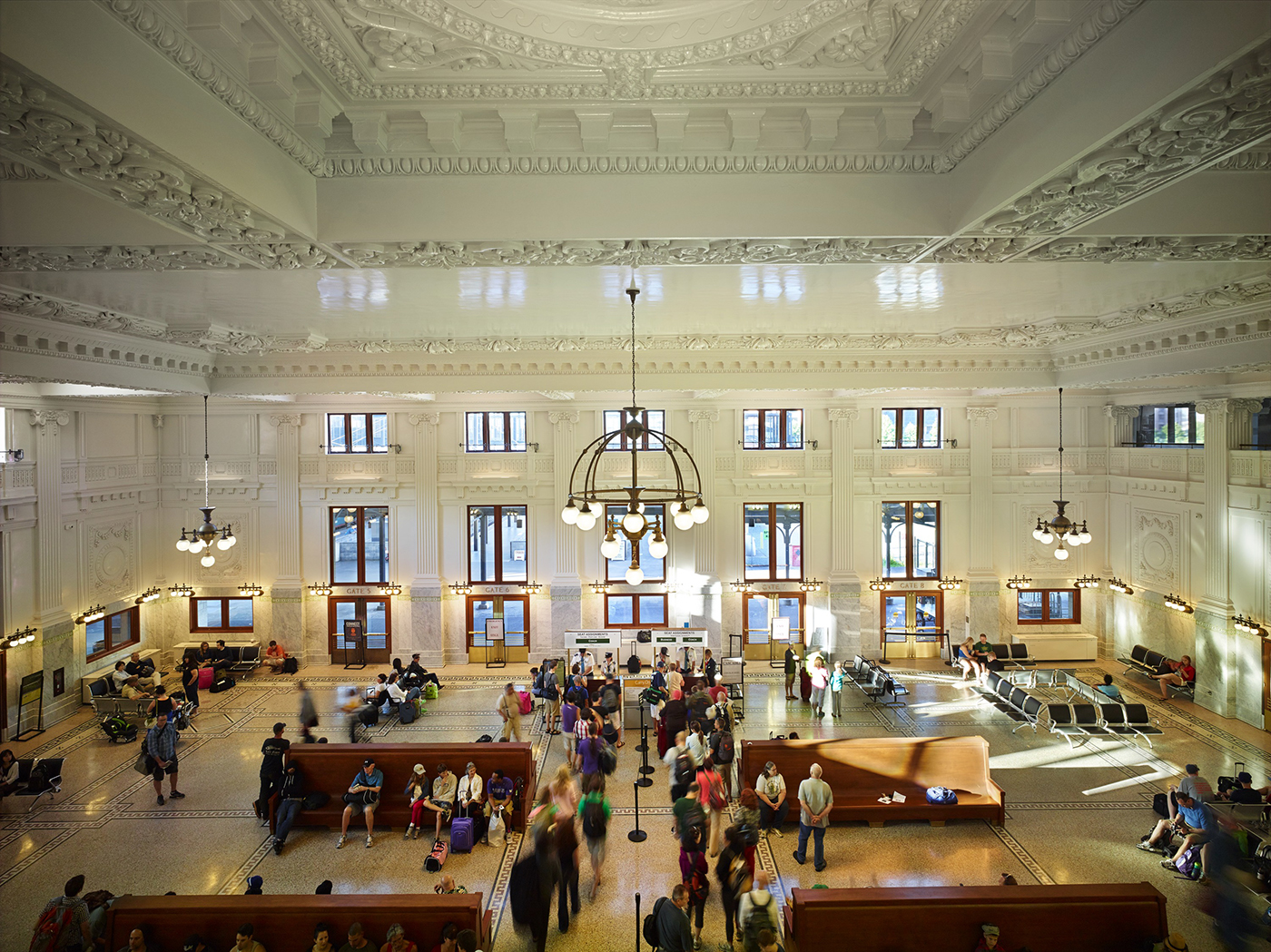 Just before the train leaves for Portland, long lines fill King Street Station. By the look of the crowd, they might as well be tourists boarding an international flight. But they don't need to travel to enjoy some old world grandeur: They're standing on mosaic floors, surrounded by high marble-and-stucco walls and ceilings.