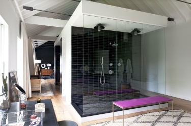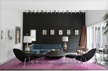 Designer Mark Zeff and his wife, Kristen, have a home in East Hampton, New York, that celebrates black in several ways. The exterior is half-white, half-black. Inside, black serves as a narrative thread for large design elements including a floating fireplace, a stained pinewood wall in the master suite, and a glass wall in the shower. Punctuation is added with black cowhide rugs; curvy Bibendum chairs by Eileen Gray; and Eero Saarinen Womb chairs.