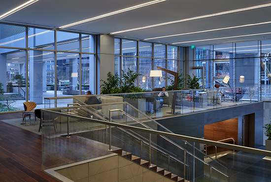 The $46 million project resulted in new finishes and a brighter space. Work involved relocating 24-foot curtain walls to expand usable interior space. Upgrades were made to bathrooms and elevator cars. The structural pinned glazing system was brought from England. Finishes include marble and stone, stainless steel curtain-wall supports and accent pieces throughout.