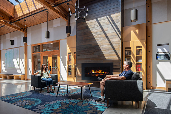 The new Rivers Building is a single-story, 14,808 square-foot multipurpose facility that serves as a gateway to the campus. Extensive use of wood in the columns, details and open scissor trusses echo the surrounding forests. Large skylights and clerestory windows provide an airy atmosphere. Students, staff and visitors enter from either end of the lobby, which can open to the outdoors using operable glazed walls.