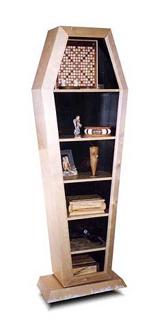 An angular, six-sided wood coffin -- hand-crafted, of course, and standing on its end -- makes a wonderful book case, great for those favorite Edgar Allen Poe classics.