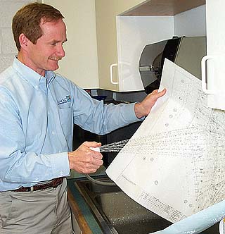 Photo by Benjamin Minnick Todd Silver, co-president of J.L. Darling, hoses down a blueprint to show its water-resistant properties. |