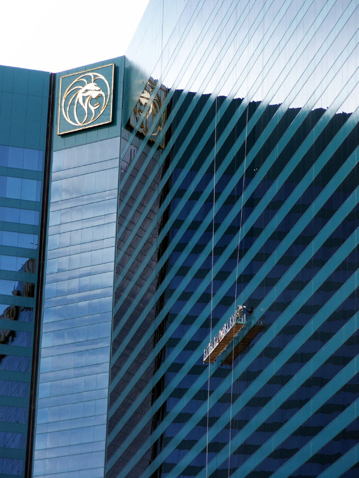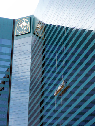 Workers used a swing stage to clean glass on the MGM hotel in Las Vegas.