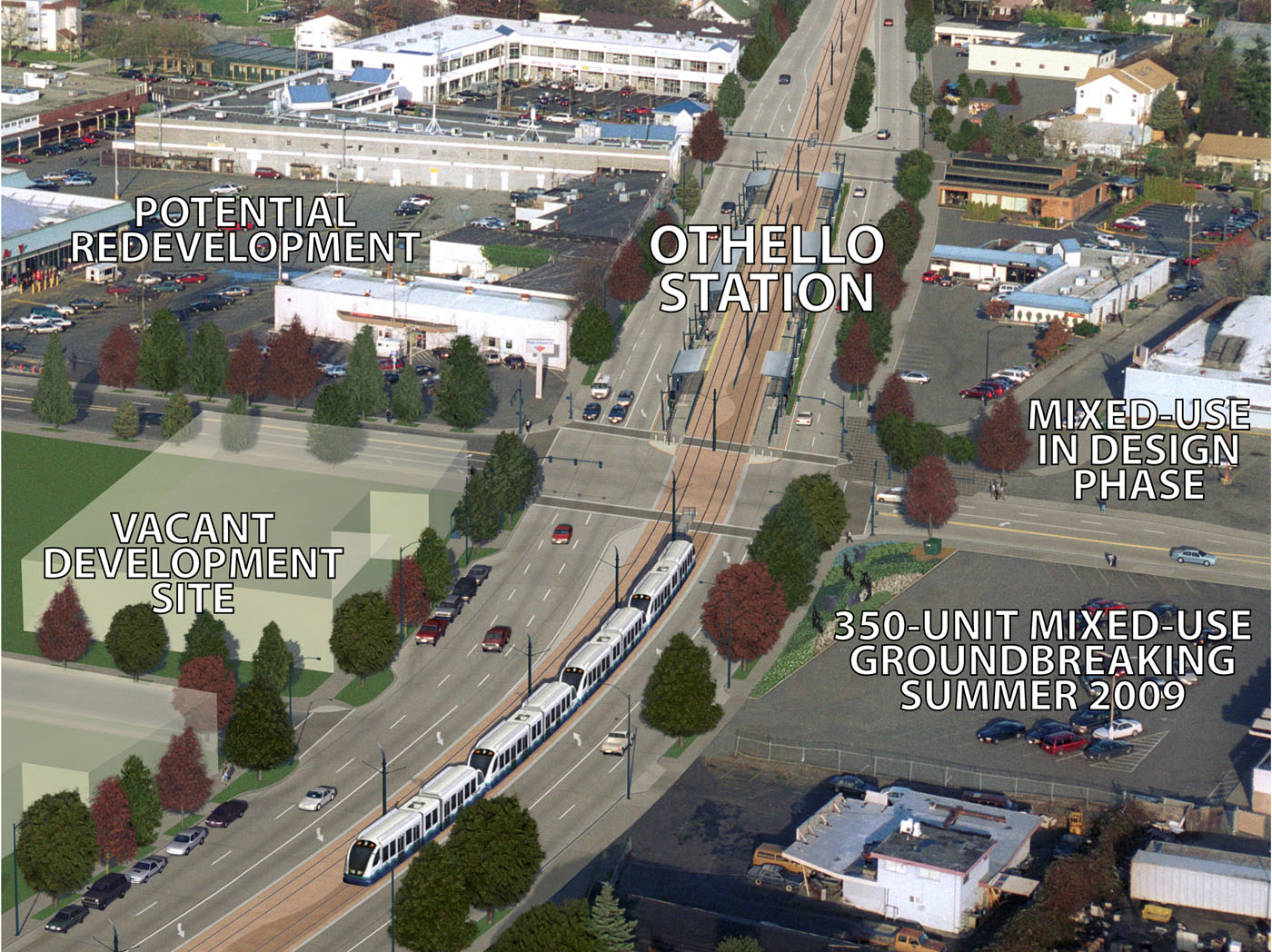 Of the five Southeast Seattle stations, Othello has the most near-term TOD opportunities. Othello Partners has a second mixed-use residential project in the design phase, located adjacent to its first. Seattle Housing Authority is in negotiations with Opus Northwest to sell a large vacant site at the south edge of the station. Just across the street, Safeway was until recently negotiating the sale of its store site for redevelopment.