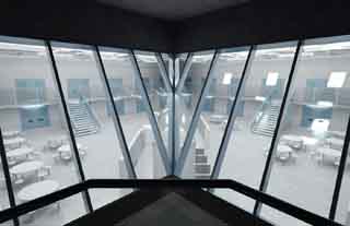 Particular attention was paid to circulation patterns and the configuration of the two main housing units, each with seven pie-shaped day rooms with cells off one side. “Because of the layout, we conserve space,” Buursma says. The jail's average per bed space is about 210 square feet. In other facilities, the proportion might be 50 to 100 percent higher, the architect adds.