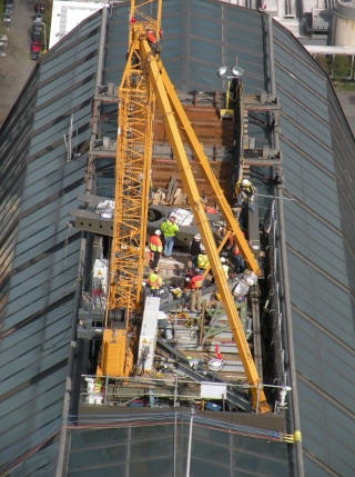The curved roof of Seattle Municipal Tower in downtown Seattle is a city landmark, but try installing a 124,500-pound building maintenance unit atop it and out goes the romance.