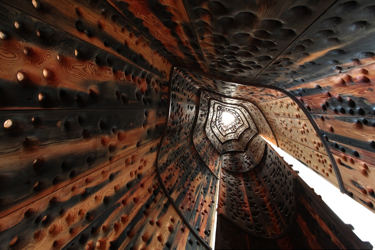 A pair of openings at the base of the sculpture allows visitors room to step inside the hollow core for a tunnel-like view of the interior, which tapers above. On the roof is a 2.5-foot-long extension of the sculpture, where it's being left to artfully deteriorate amid the elements.