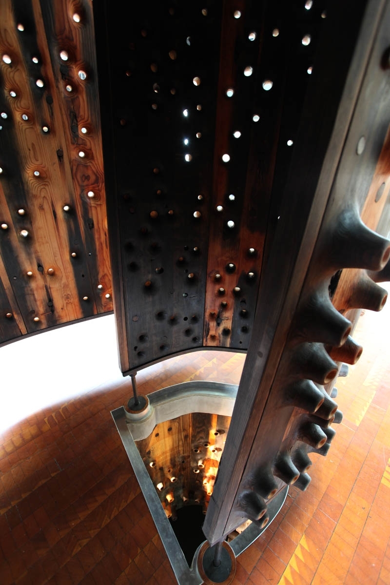The system he devised for the sculpture involved nine sets of steel collars that bolt together, each adding another vertical tier ranging from about 3.5 to 9 feet long. Carefully cut wood planks — about 200 in all — each slide snugly into the collars, obscuring them from view. Steel ribs run between the top and bottom of the collars and nestle vertically between the planks to help hold them in place. Small gaps between the planks allow room for the wood to expand and contract.