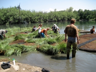 Individual island modules are cinched together, planted with native vegetation, and anchored into place.