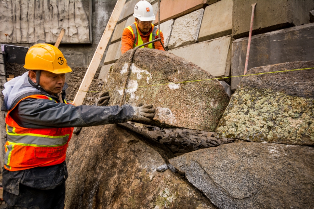 Once the stones were fine-tuned and moved to the Japanese Garden, workers wrapped them with cables and lifted them with excavators. Teams used ropes, poles and their hands to guide and lower the stones. Awata then checked each stone for its alignment and balance.