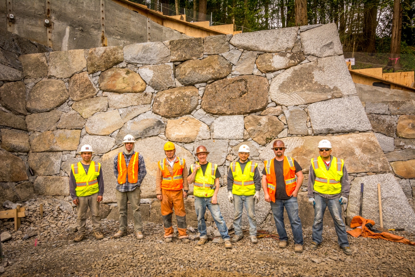 The project, a retaining wall called the Castle Wall at the Portland Japanese Garden, involved 1,000 tons of Eastern Oregon granite to build the 185-foot-long, 20-foot-tall wall. The first of its kind in North America, the wall required 3,400 labor hours to cut, chisel and stack the granite.