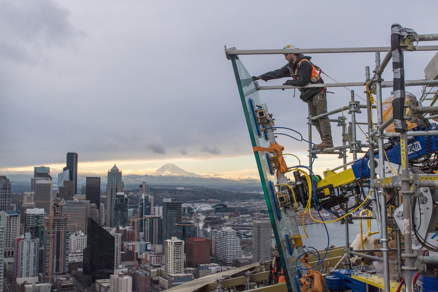 Crews at the Space Needle are installing the last of 48 giant glass panels around the outside of the 520-foot-high observation deck.