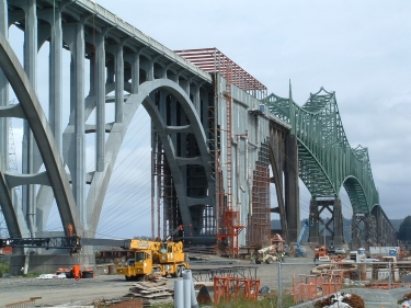 Hamilton Construction Co. in 2013 finished a six-year rehab of the south approach of the US 101 Conde McCullough Memorial Bridge in North Bend, Ore. Its steel trusses are painted ODOT Green.