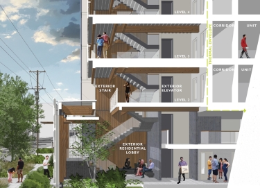 The exterior sheathing joints will be taped to reduce air leakage, saving energy by limiting the amount of conditioned air that is lost. The building's elevator and central stair will be outside of the building to reduce the amount of interior space that needs to be conditioned.