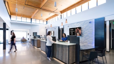 The best way to do that, Speidell said, is in an environment that promotes wellness. The HAPO Community Credit Union, contemporary in its exterior design, reveals an interior design that focuses on meeting high standards in the areas of air freshness, healthy lighting, clean water and worker stations with adjustable standing desks.
