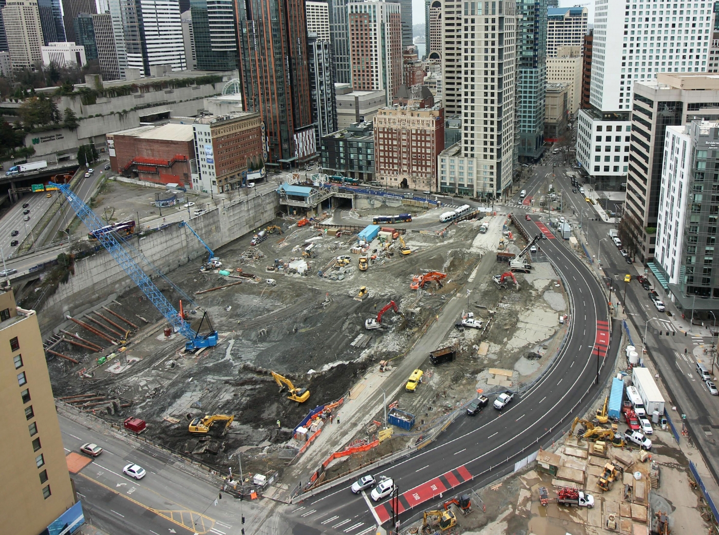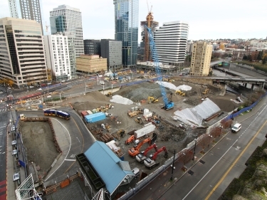 Rerouting Olive Way (curved road on the right) was one of the most complex early-work jobs. Its construction schedule was compressed from seven to four weeks.