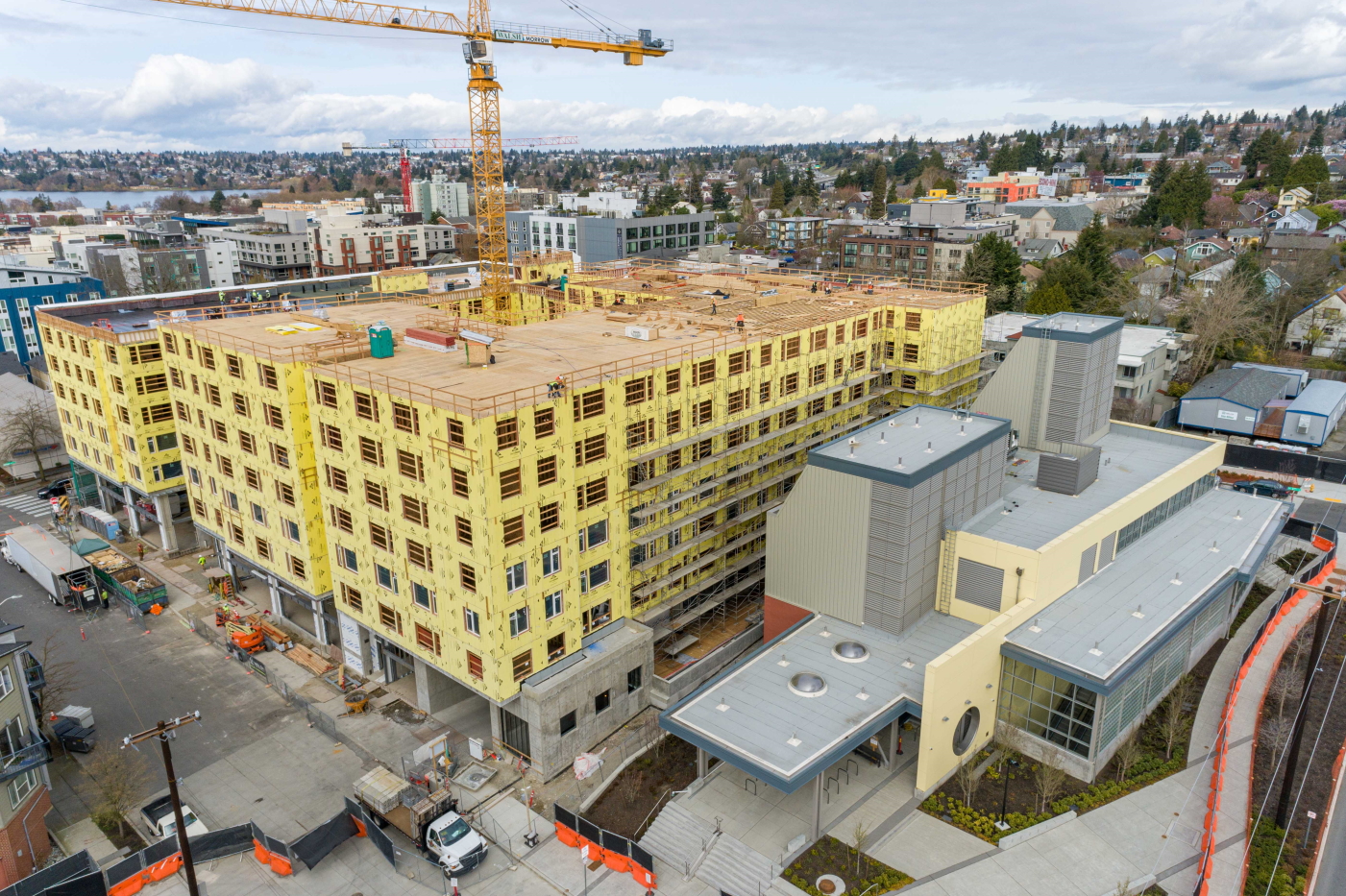 In early 2020, Walsh completed Plymouth Housing’s Almquist Place project (foreground) and LIHI’s An Lac Apartments (background, to the right).