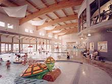 From the second floor, there are views of the teen center, climbing wall, gymnasium and pools. The natatorium features two large pools: a lap pool and a second pool which starts at zero feet deep so wheelchairs have easy access. That pool also features a 120-foot slide and a giant turtle that spurts water.