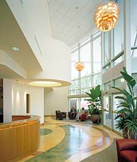 Resting on a sloping, 32-acre site, the Harrison Silverdale Healthcare Campus, at 1800 N.W. Myhre Road, complements its woodsy surroundings by making use of components of Northwest lodge architecture, including high ceilings, dormer windows and the indoor use of exterior materials.