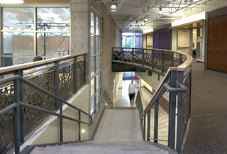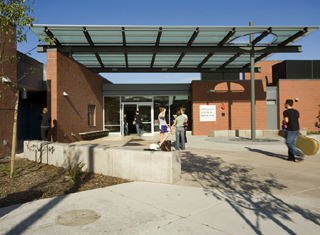 The main entrance has a large glass, steel and wood canopy to welcome visitors. Inside, large operable windows allow natural light in each room.