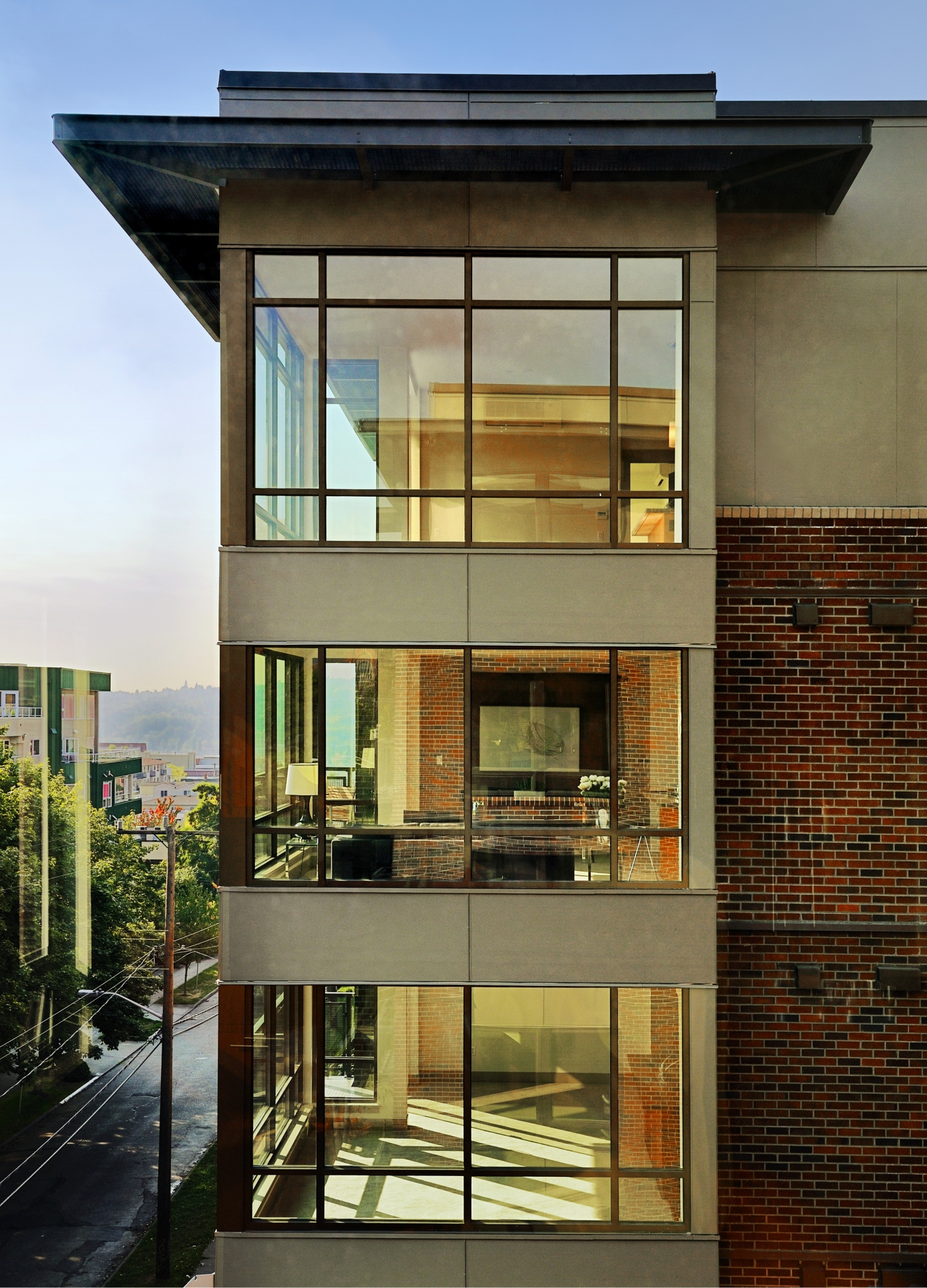 Detailed brick sills and accent copings were designed to give the project a sense of refinement and permanence. Punched windows in the masonry wall provide a visual counterpart to the glazed corner bays.