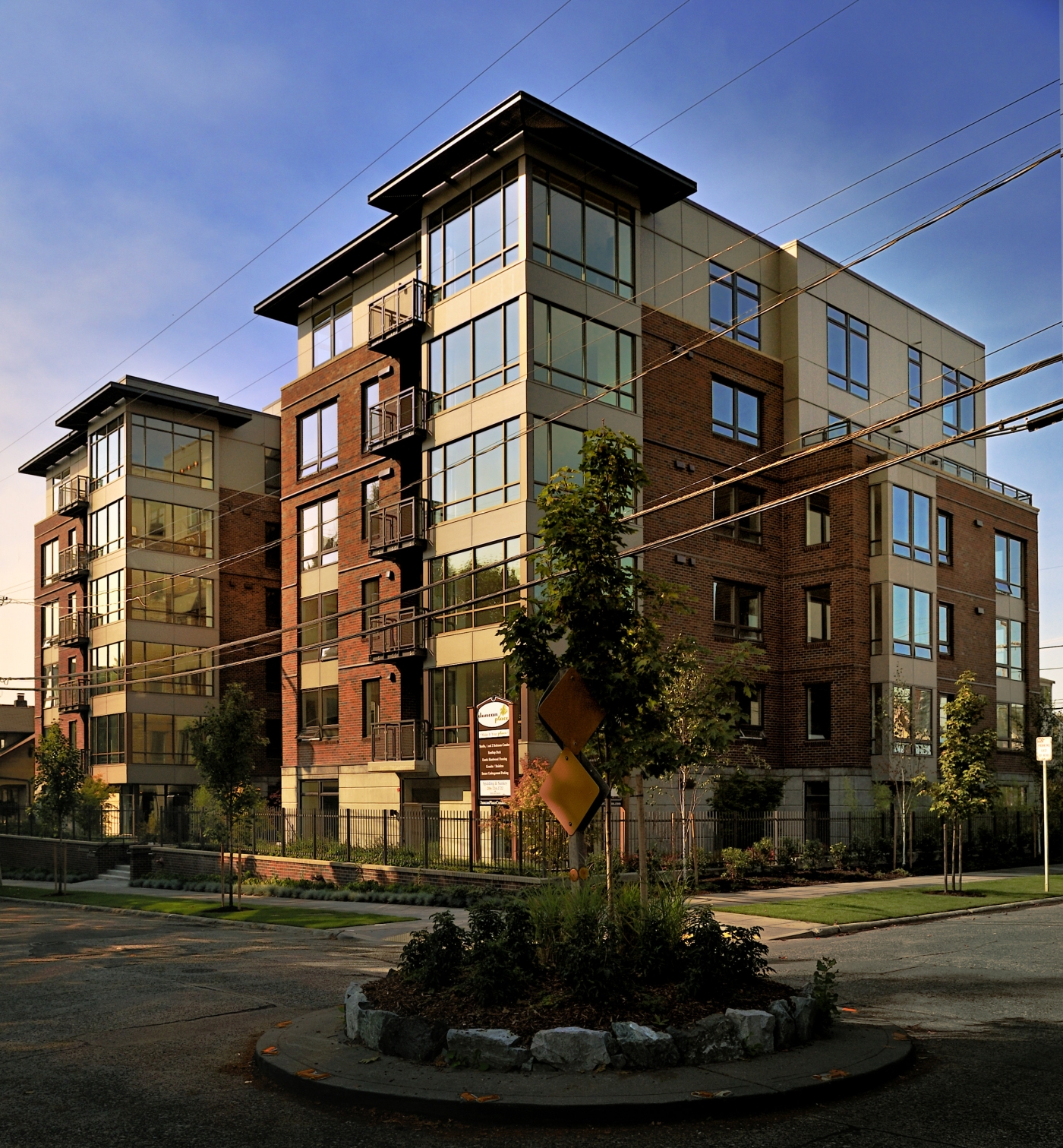 A masonry exterior was used to visually connect Duncan Place with the brick architecture found on the nearby University of Washington campus. The building has corner glass towers and a series of large tuck-in balconies.