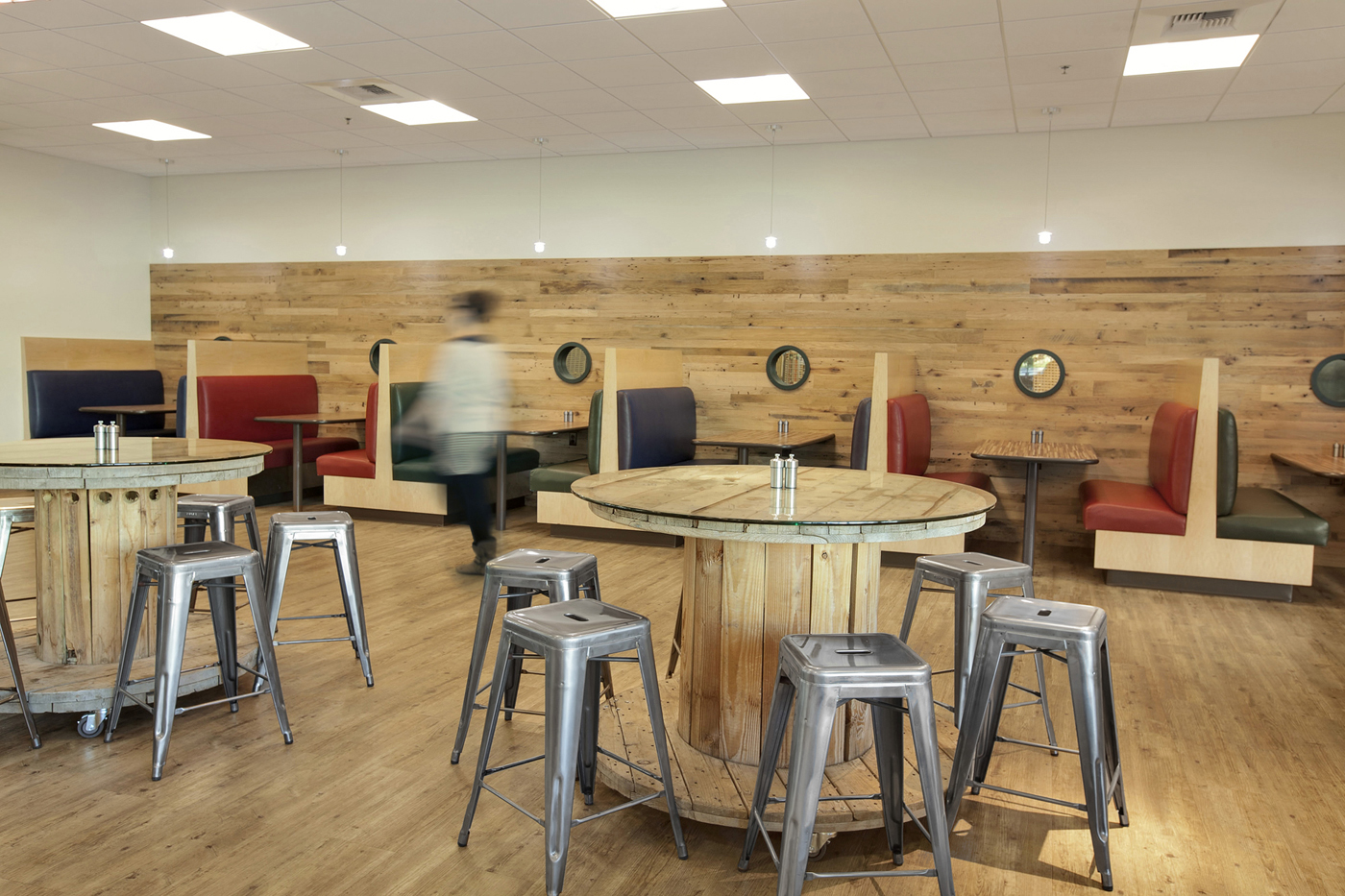 The most recent renovation to the third building has a travel theme, with a coffee bar made to look like a cruise ship. There are lounge areas, a climbing wall, conference center, shower rooms, a theater and fitness center.