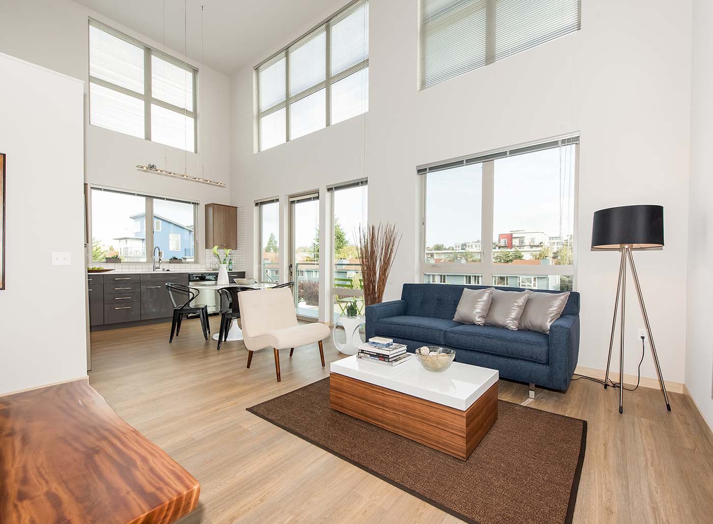 Units have open floor plans, floor-to-ceiling windows, low-VOC finishes, passive ventilation, water-saving plumbing, energy-efficient lighting and Energy Star appliances.