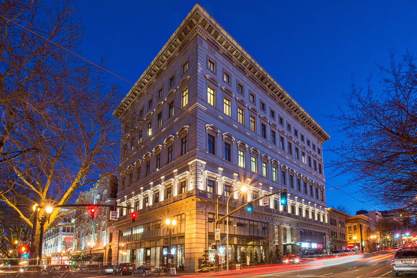 A new glass and steel awning opens into a space with ceilings decorated with the original ornate gilt plaster relief. The lobby has a custom-designed check-in desk inspired by a vintage librarian's table, as well as a turkish-inspired rug, and roughhewn wood tables that pay homage to the building's retail history as well as the Northwest's heritage as a timber capital.