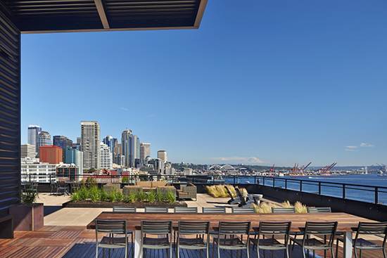 The building has a library, private guest suite for visitors, bicycle workshop and storage, rooftop pet walk and deck with views of Elliott Bay.