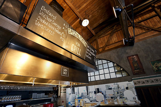 The establishment serves draft and bottled beer, and cocktails. The menu is classic beer hall fare with a Northwest influence, such as soft Bavarian pretzels, wiener schnitzel and a variety of grilled sausages with sauerkraut.
