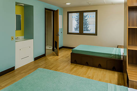 The space is accented with bright colors, and has double- and single-occupancy rooms, nurses’ station and common areas.