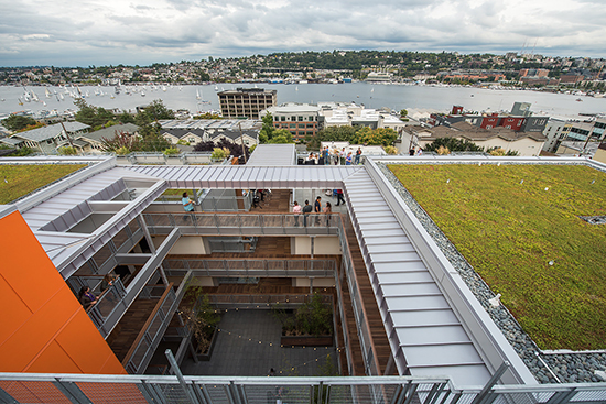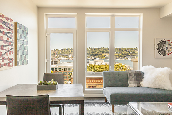 Dexter Hayes is a four-story mixed-use building overlooking Lake Union at 1701 Dexter Ave. N.