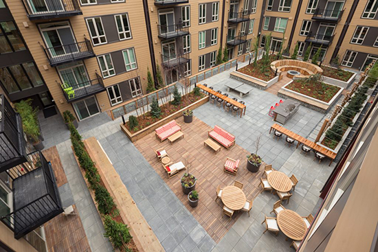 There are two-bedroom, one-bedroom, live/work units, lofts and studios, with at least one parking stall for every unit. Amenities include a residential lobby, community room and a two-story courtyard with community spaces. There is also a demonstration kitchen with a large dining room.
