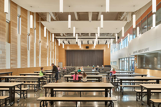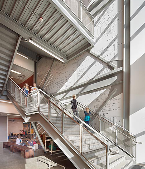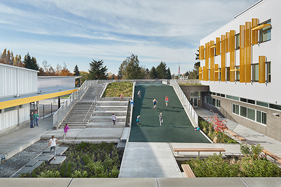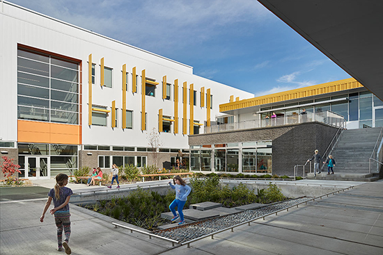 The school integrates with its 3.2-acre site to create an indoor/outdoor learning lab, with a living wall in main entry, green roofs and terraces.