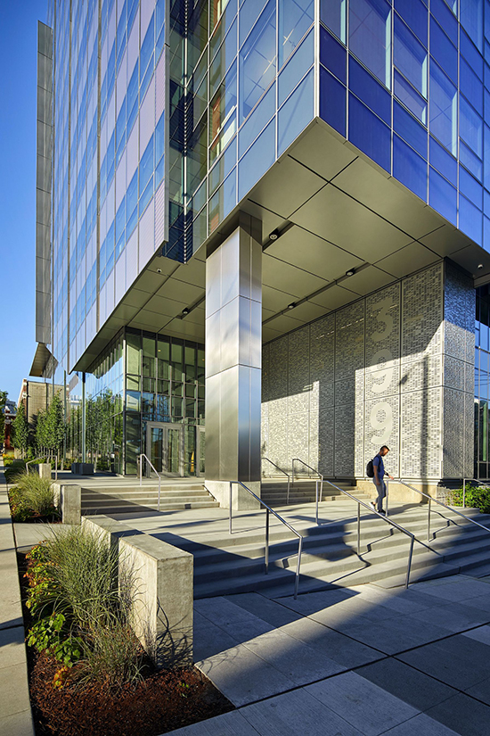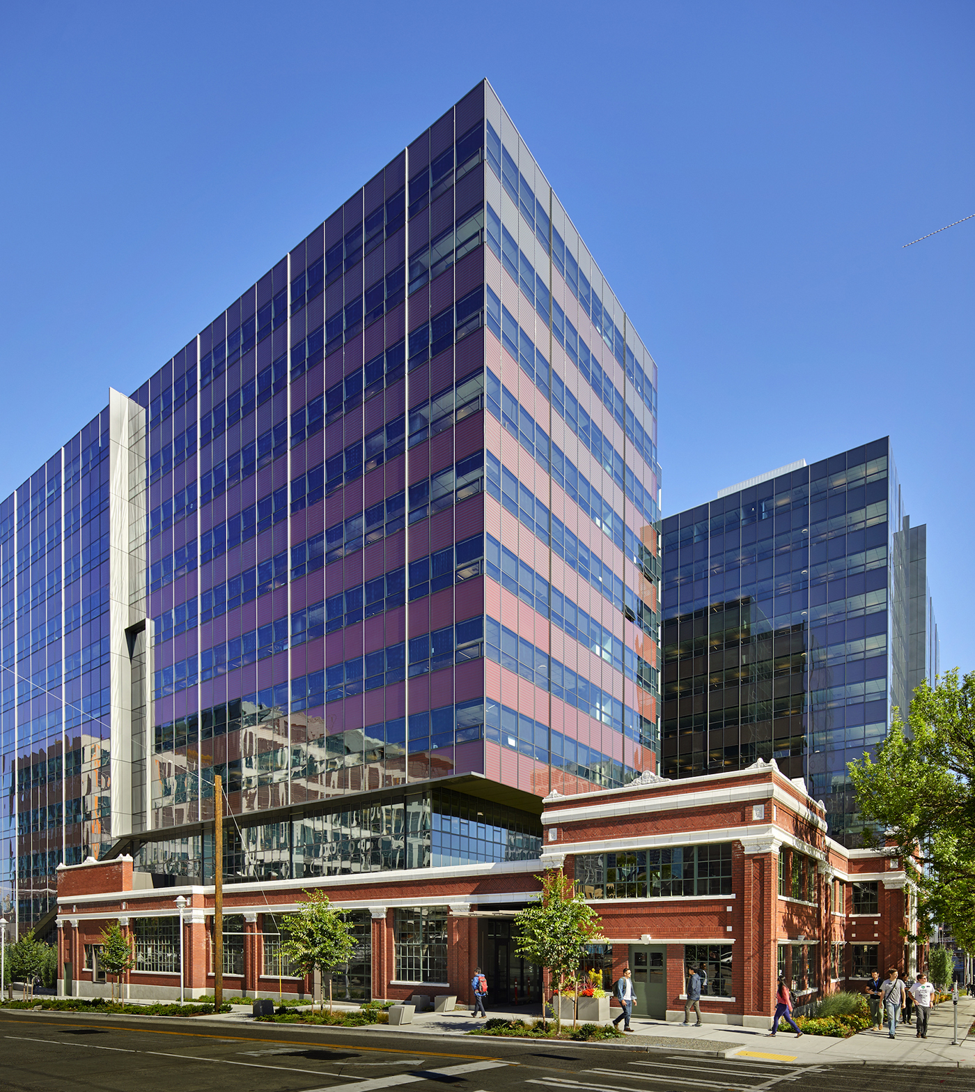The landmarked facades of the Troy Laundry and Boren Investment buildings make up the bases of the new glass towers. The 13-story north tower at 399 Fairview Ave. N. has 419,000 square feet. The 12-story south tower at 300 Boren Ave. N. has 391,000 square feet.