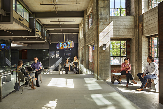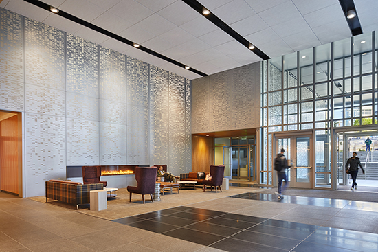 An artwork called “City Fragment,” in the courtyard at the top of Boren Hill, uses thousands of small, blackened stainless steel rods to connect viewers to the neighborhood’s past. An active video sculpture, “Mechanism” in the arcade walkway, uses moving images and machined artwork inspired by industrial equipment from the Troy Laundry.
