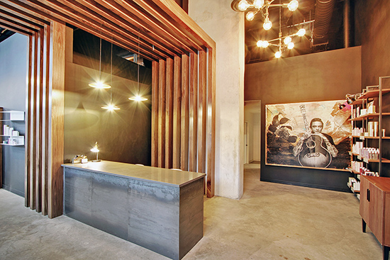 The design uses a minimalist palette of concrete, walnut and steel, creating a clean canvas for original art pieces, including a portrait of the salon's namesakes by local artist Cheyenne Randall.