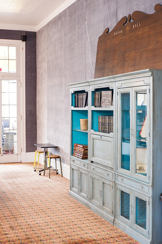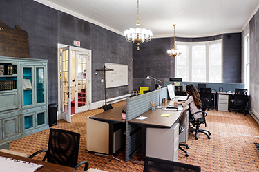 The historic, 15,000-square-foot building combines an artist studio, event hall and office co-working spaces. Work included repairs, bringing the building up to modern fire safety code and restoring the gas fireplaces.