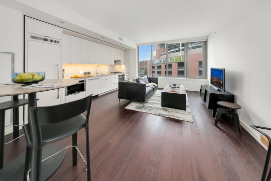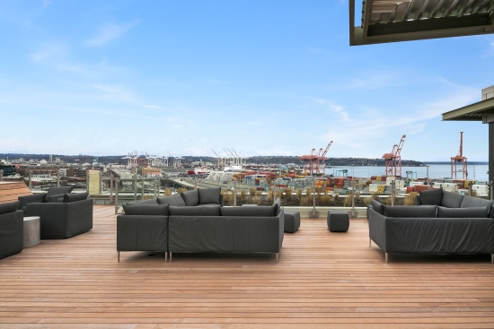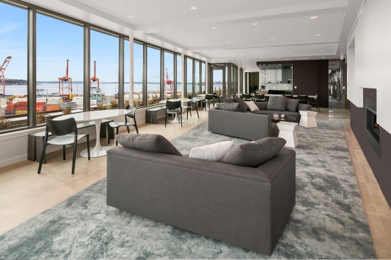 Gridiron has a clubroom with a kitchen, lounge seating, fireplace, wine nook with individual wine lockers, and a fitness room. A rooftop terrace offers views of the waterfront.