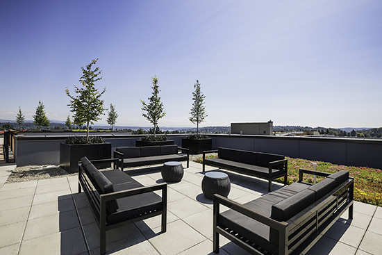 The building includes studio, one- and two-bedroom units, as well as live/work units and commercial space. Residents also have access to a gym, and a rooftop space with a dog run and patio areas.